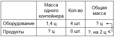 Масса контейнеров с продуктами на 2 ц меньше массы контейнеров с оборудованием, значит, масса контейнеров с продуктами:
