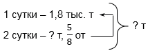 На шахте за первые сутки выработали 1,8 тыс. т угля, а за вторые - от выработки в первые сутки. Знаменатель дроби показывает, что массу угля, выработанного за первые сутки, нужно разделить на 8 равных частей, а числитель - то, что нужно взять 5 таких частей, следовательно, за вторые сутки выработали: