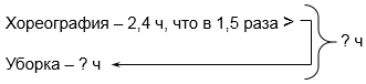 Занятие хореографией заняло 2,4 ч, что в 1,5 раза больше времени, затраченного на уборку своей комнаты. Значит, на уборку комнаты Таня затратила:
