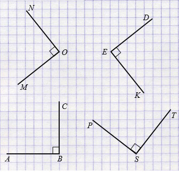 Постройте, используя чертежный треугольник, четыре прямых угла (положения углов разные).