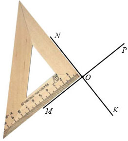 Затем вершину прямого угла чертежного треугольника совмещаем с точкой О, а одну из сторон с лучом ОМ.