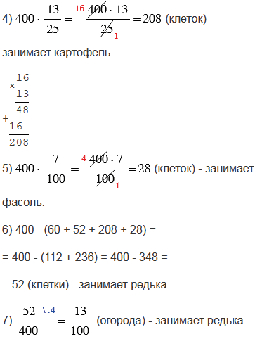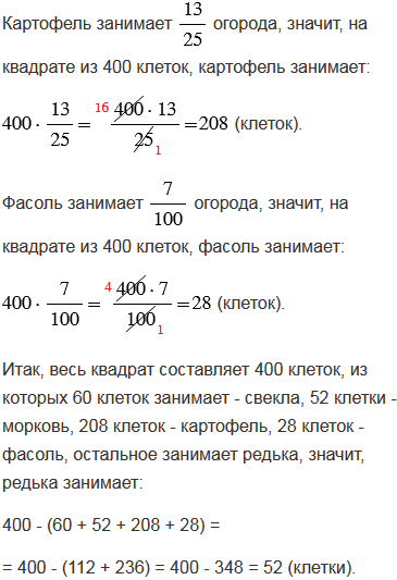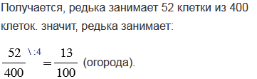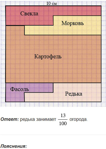 , а остальная часть огорода занята редькой. Закрасьте на рисунке часть огорода, занятую каждой культурой. Какую часть огорода занимает редька?