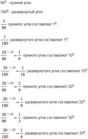Найдите, какую часть прямого и какую часть развернутого углов составляют углы, равные 10, 100, 200, 300, 450, 600, 750, 900.