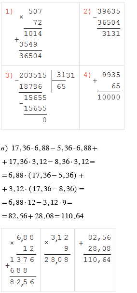 В пункте в) вычисления удобно выполнять не по действиям, а, используя распределительное свойство умножения относительно сложения и относительно вычитания, так как это упрощает вычисления.