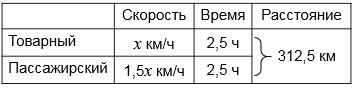 От двух станций, расстояние между которыми 312,5 км, одновременно навстречу друг другу вышли товарный и пассажирский поезда и встретились через 2,5 ч. С какой скоростью двигались поезда, если скорость пассажирского поезда была в 1,5 раза больше скорости товарного поезда