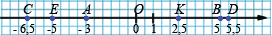 Отметьте на координатной прямой точки А(-3), В(5), С(-6,5), D(5,5), E(-5), K(2,5).