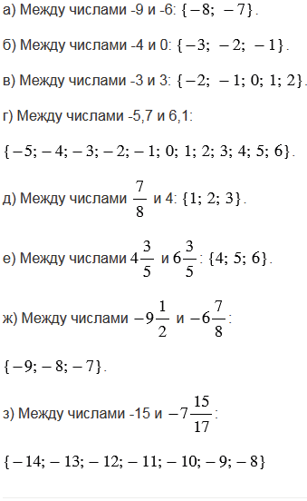 Запишите множество целых чисел, расположенных на координатной прямой между числами: