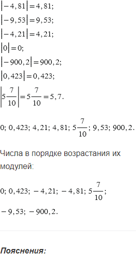 Расположите числа в порядке возрастания их модулей: -4,81; -9,53; -4,21; 0; -900,2; 0,423;