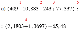 а) (409 - 10,883 - 243 + 77,337) : (2,1803 + 1,3697);