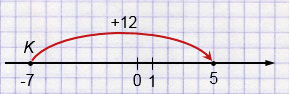Точка K(-7) после перемещения на координатной прямой попала в точку с координатой 5, значит, точка K переместилась вправо и это перемещение обозначается положительным числом. То есть получаем, что точка K переместилась на 12 единиц.