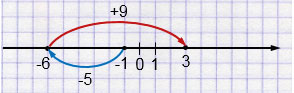 в) -1 + (-5) + 9 = -6 + 9 = 3