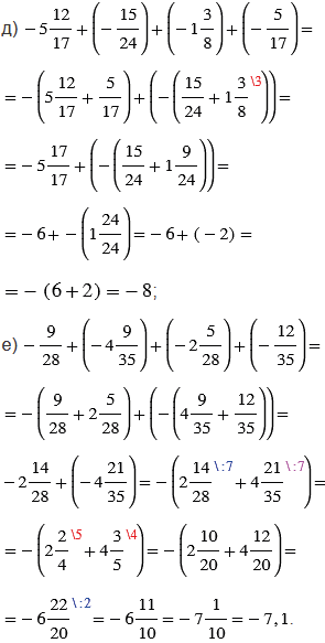 В пунктах д) и е), чтобы упростить вычисления, используем переместительное и сочетательное свойства сложения (группируем слагаемые с одинаковыми знаменателями или с такими знаменателями, которые проще привести к общему знаменателю).