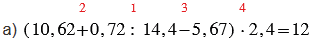 а) (10,62 + 0,72 : 14,4 - 5,67) • 2,4;