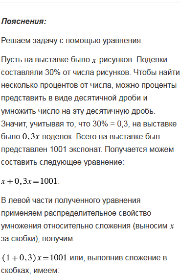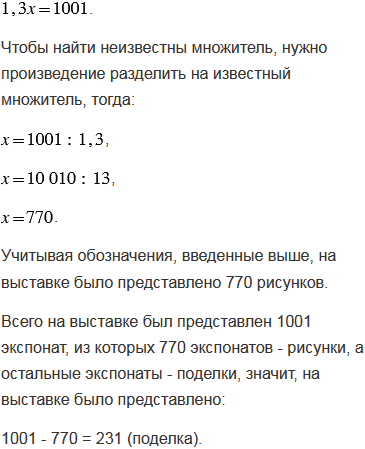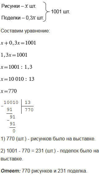 На выставке детского творчества были представлены рисунки и поделки из природного материала - всего 1001 экспонат. При этом поделки составляли 30% от числа рисунков. Сколько рисунков и сколько поделок было представлено на выставке?