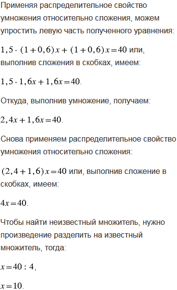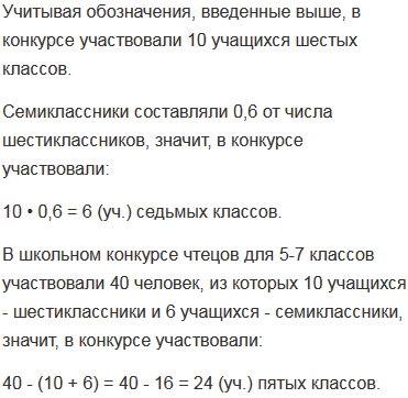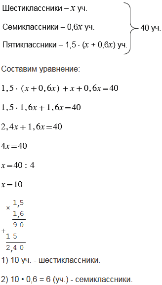В школьном конкурсе чтецов для 5-7 классов участвовали 40 человек. Учащихся 5 классов было в 1,5 раза больше, чем учащихся 6 и 7 классов вместе. Семиклассники составляли 0,6 от числа шестиклассников. Сколько учащихся каждого класса приняли участие конкурсе?
