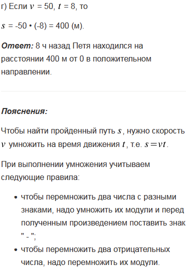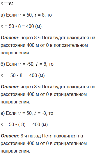 м/мин. Отметим его местоположение на координатной точкой О, у которой координата равна 0 (рис. 4.46). Будем считать скорость положительной, если Петя движется в положительном направлении, и отрицательной - если в отрицательном. Значение