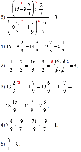 Обратите внимание, красные числа, стоящие сверху над действиями, указывают порядок действий, только в пункте а) не указано шестое действие - это черта дроби (действие деления числителя на знаменатель), в пункте б) не указано пятое действие - это черта дроби.