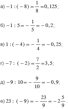 Чтобы найти частное двух чисел с разными знаками, надо разделить модуль делимого на модуль делителя и поставить перед полученным числом знак "-".