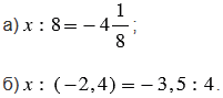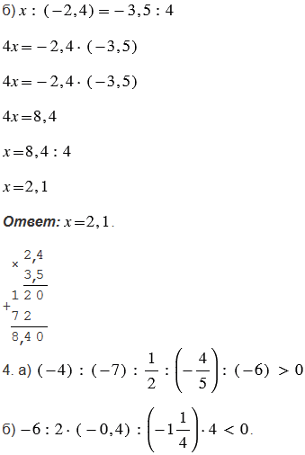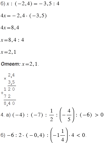 В третьем задании в пункте а) помним, чтобы найти неизвестный множитель, нужно произведение разделить на известный множитель. В пункте б) сначала используем основное свойство пропорции, согласно которому произведение крайних членов пропорции равно произведению ее средних членов, а затем также находим неизвестный множитель.