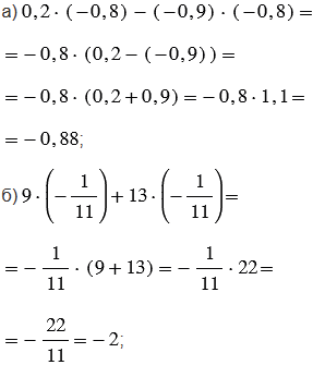 При выполнении вычислений используем распределительное свойство умножения, т.е. в пунктах а), б) и в) выносим одинаковые множители за скобки, затем выполняем вычисления в скобках и умножаем полученный результат на вынесенный множитель, а в пункте г), наоборот, раскрываем скобки умножая каждый из компонентов, стоящих в скобках, на множитель, стоящий за скобками, затем складываем полученные произведения.