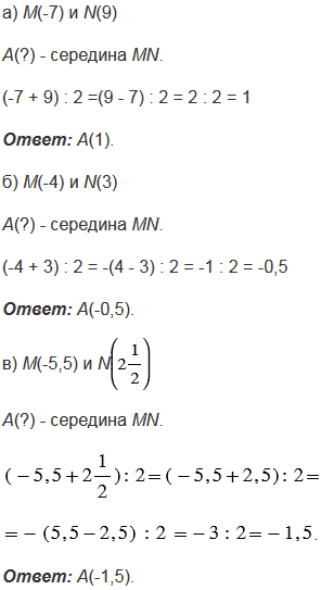 Чтобы найти координаты середины отрезка, надо найти среднее арифметическое координат концов этого отрезка. Средним арифметическим двух чисел называется частное от деления суммы этих чисел на 2.