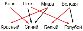 Решите с помощью графа задачу: "У Коли, Пети, Миши и Володи мячи разных цветов (красный, синий, белый, голубой). На вопрос "У кого какой мяч?" три мальчика ответили; 1) "У Миши синий мяч, у Володи белый"; 2) "У Миши красный мяч, у Пети синий"; 3) "У Коли синий мяч, у Володи голубой". В каждом ответе только одна часть правда. Какого цвета мяч у каждого мальчика?"