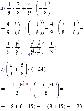 В пункте д) применяем распределительное свойство умножения относительно сложения, то есть умножаем каждое слагаемое из скобок на множитель, стоящий за скобки, и складываем полученные результаты.