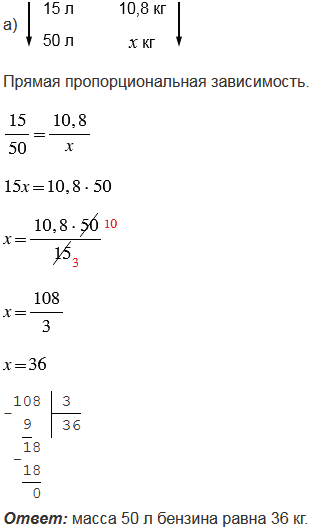 а) Чему равна масса 50 л бензина, если масса 15 л бензина равна 10,8 кг?