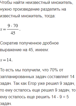Егор решил 9 задач из запланированных, что составило 45%. Сколько задач ему надо ещё решить, чтобы выполнить свой план на 70% и пойти гулять?