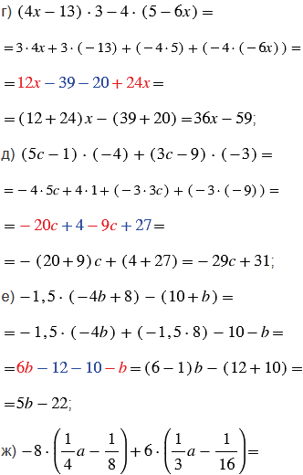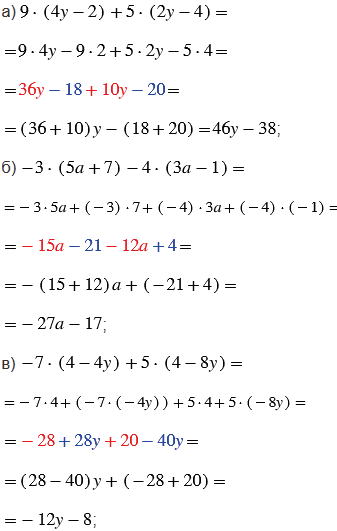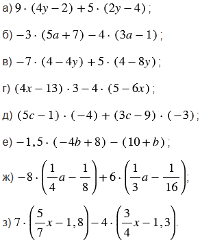 Чтобы упростить выражение, сначала раскрываем скобки. Чтобы раскрыть скобки, нужно множитель, стоящий за скобками, умножить на каждое слагаемое, стоящее в скобках (учитываем то, что вычитание можно заменить сложением с противоположным числом). При этом помним: