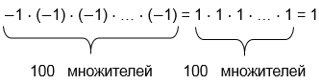 Чтобы перемножить два отрицательных числа, надо перемножить их модули. Значит, произведение четного числа отрицательных множителей будет числом положительным, следовательно, произведение сотни множителей (100 - четное число), каждый из которых равен -1, будет равно 1.