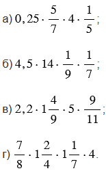 При вычислениях используем переместительное и сочетательное свойства умножения, то есть группируем множители так, чтобы вычисления были проще.