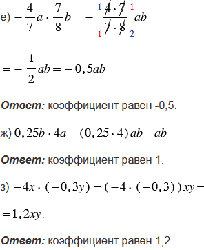 Если в произведении дано несколько чисел, то используя переместительное и сочетательное свойства умножения, эти числа нужно перемножить и число, которое получится при умножении, и является коэффициентом.