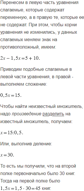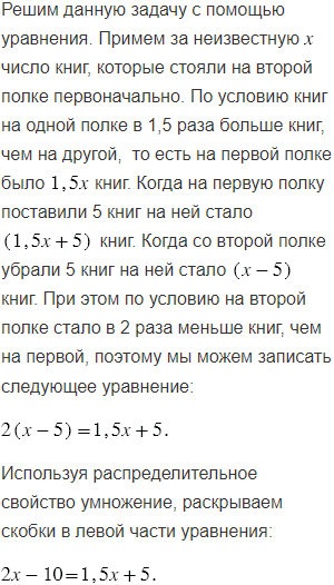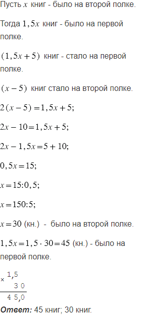 На одной полке в 1,5 раза больше книг, чем на другой. Со второй полки переставали на первую 5 книг, и на второй стало в 2 раза меньше книг, чем на первой. Сколько книг было на каждой полке первоначально?