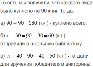 Было куплено одинаковое количество научно-познавательных и научно-фантастических книг. Часть научно-познавательных книг отправили в школьную библиотеку. В 1,2 раза меньшее число научно-фантастических книг отдали для вручения победителям викторины. После этого для подарков шестиклассникам научно-познавательных книг осталось 30, а научно-фантастических - 40 книг. Сколько книг было: а) куплено; б) отправлено в школьную библиотеку; в) отдано для вручения победителям викторины?