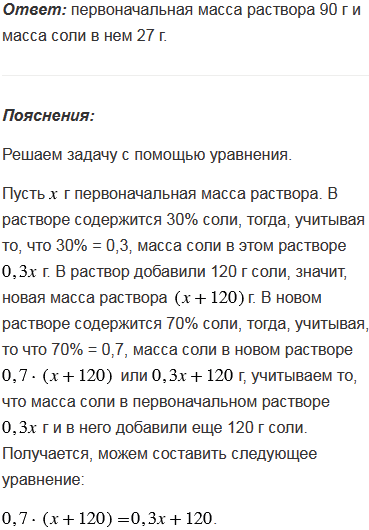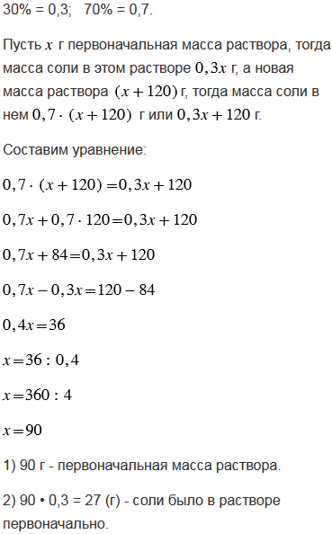 В растворе содержится 30% соли. Если добавить 120 г соли, то в растворе будет содержаться 70% соли. Какова первоначальная масса раствора? Сколько граммов соли было в растворе первоначально?
