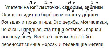Ул..тели на юг1 ласточки, скв..рцы, зяблики. Од..ноко с..дит на б..рёзовой ветке у д..роги б..льшая и тихая птица. Это деряба. М..лч..ливая, не очень нарядная, эта птица осталась верной р..дному лесу. Вмест.. с лесом она стойко переносит зимние м..розы и л..денящие м..тели.