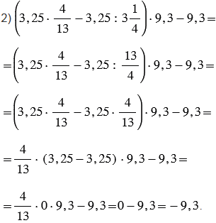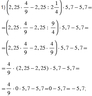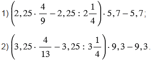 В каждом из выражений сначала преобразуем смешанные числа, стоящие в скобках в неправильные дроби. Затем от деления в скобках переходим к умножению. В скобках получается одинаковый множитель, который выносим за скобки (распределительное свойство умножения). В скобках остается разность, которая равна нулю, а при умножении на ноль всегда получается ноль.