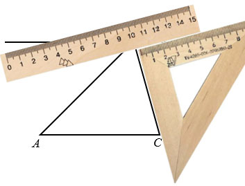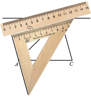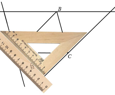 Далее, не меняя положения линейки, двигаем вдоль нее чертежный треугольник до точки В и проводим через точу В прямую, которая будет параллельна стороне АС.
