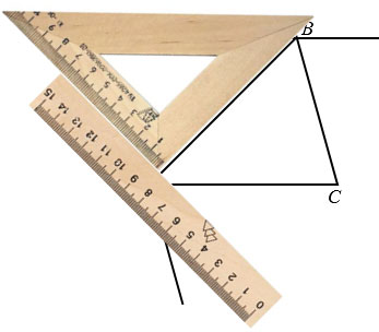 Чтобы провести прямую параллельную стороне ВС, проходящую через точку А, прикладываем чертежный треугольник к стороне ВС одной из его сторон образующих прямой угол, а вдоль другой стороны чертежного треугольника, образующей прямой угол, прикладываем линейку.