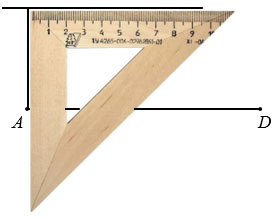 Видим, что сторона АВ расположена вдоль другой стороны чертежного треугольника, образующей прямой угол. Значит, сторона АВ перпендикулярна АD, то есть сторона АВ