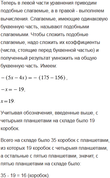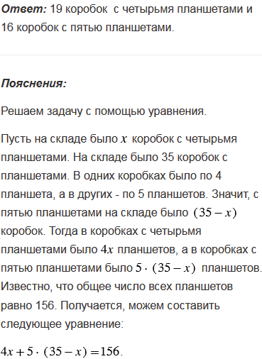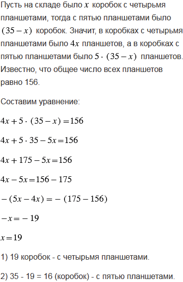На складе было 35 коробок с планшетами. В одних коробках было по 4 планшета, а в других - по 5 планшетов. Сколько на складе было коробок с четырьмя планшетами и сколько с пятью планшетами, если общее число всех планшетов равно 156?