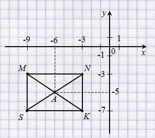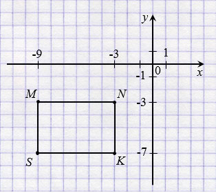 Чертим прямоугольную систему координат с единичным отрезком 1 клетка. Отмечаем в этой системе координат точки М(-9, -3), N(-3; -3;), K(-3; -7), S(-9; -7).