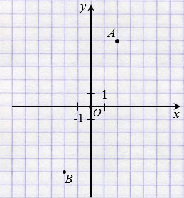 Чертим прямоугольную систему координат с единичным отрезком 1 клетка. Отмечаем в этой системе координат точку А(2; 5) и точку В с противоположными координатами. Противоположные числа отличаются только знаками, значит, В(-2; -5).