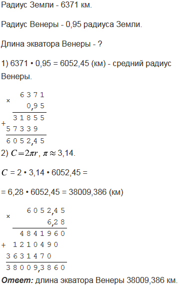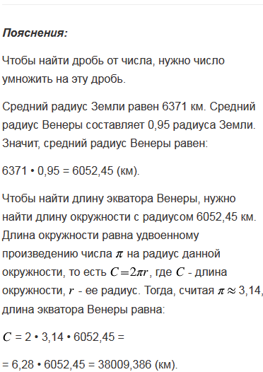 Средний радиус Венеры составляет 0,95 радиуса Земли. Найдите длину экватора Венеры, если средний радиус Земли равен 6371 км.