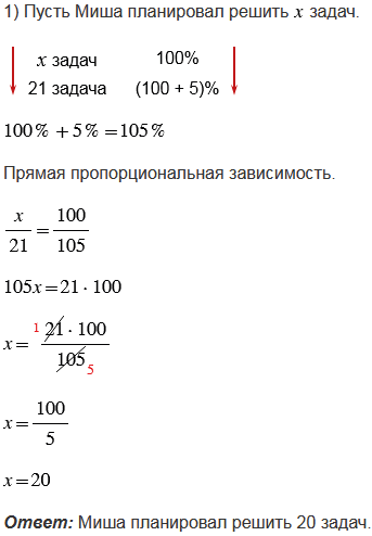 1) Миша перевыполнил план по решению задач на 5% и решил 21 задачу. Сколько задач он планировал решить?