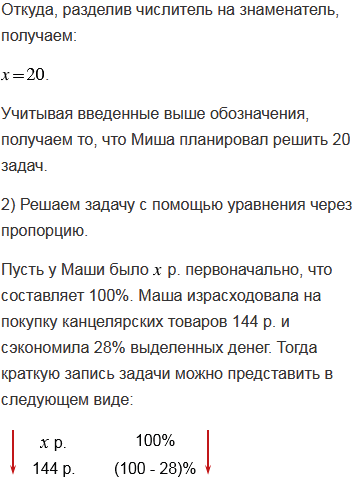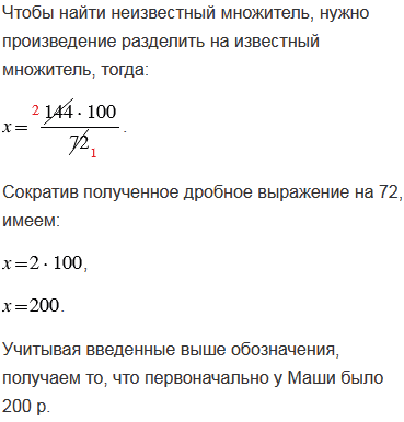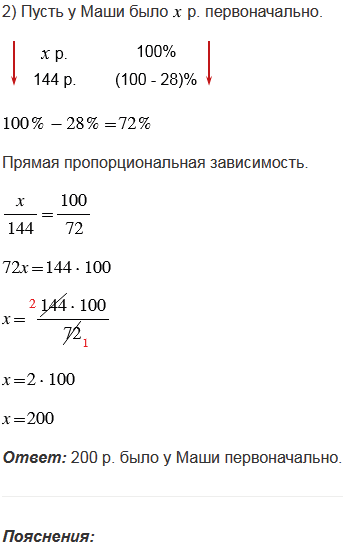2) Маша израсходовала на покупку канцелярских товаров 144 р. и сэкономила 28% выделенных денег. Сколько рублей было у Маши первоначально?