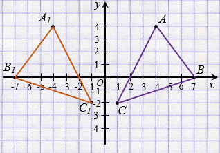 Значит, точкам А(4; 4), В(7; 0), С(1; -2) относительно оси ординат симметричны точки А1(-4; 4), В1(-7; 0), С1(-1; -2), тогда треугольнику АВС относительно оси ординат симметричен треугольник А1В1С1.