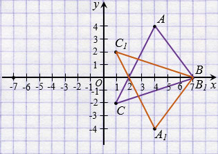 Значит, точкам А(4; 4), В(7; 0), С(1; -2) относительно начала координат симметричны точки А1(-4; -4), В1(-7; 0), С1(-1; 2), тогда треугольнику АВС относительно начала координата симметричен треугольник А1В1С1.
