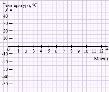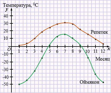 В таблице приведены среднемесячные температуры жаркого (Репетек в Каракумах) и холодного (Оймякон в Якутии) мест. Начертите графики изменения температуры в Репетеке и Оймяконе в одной координатной плоскости. Масштаб горизонтальной оси 1 месяц в 1 см, вертикальной - 10 0С в 1 см.